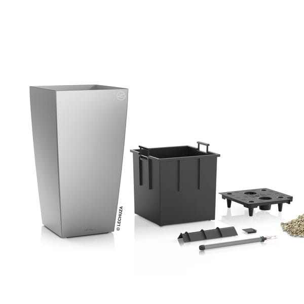 Komplet „All-Inclusive” zawiera: donicę, wkład wewnętrzny, zestaw nawadniający ze wskaźnikiem poziomu wody/pożywki, substrat LECHUZA-PON.