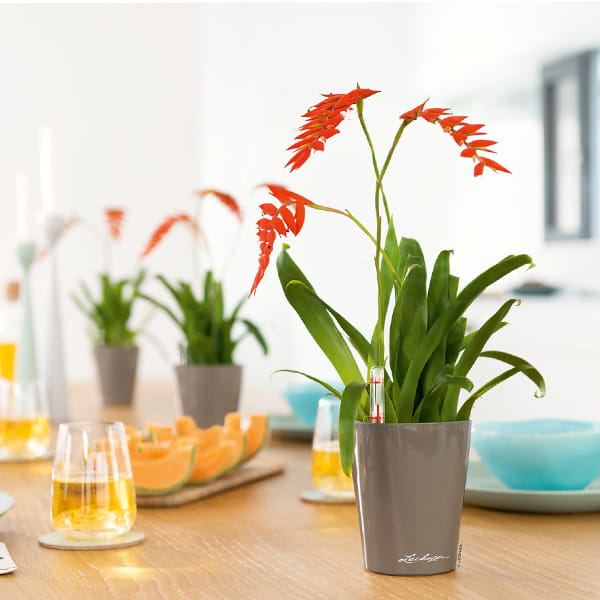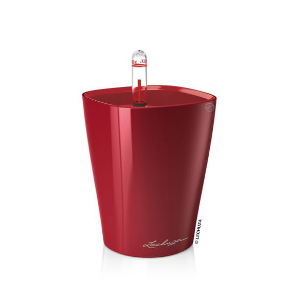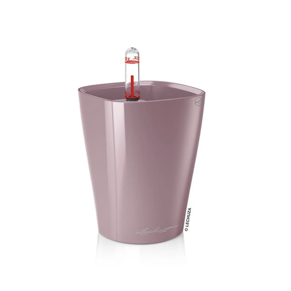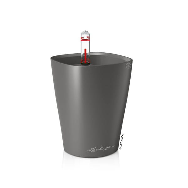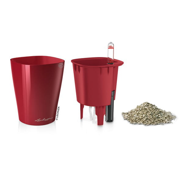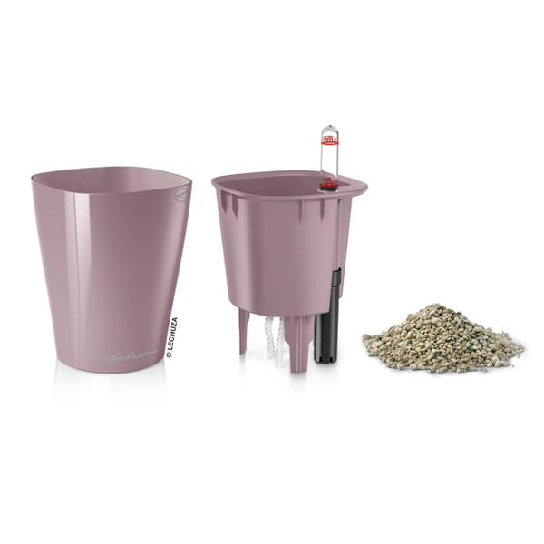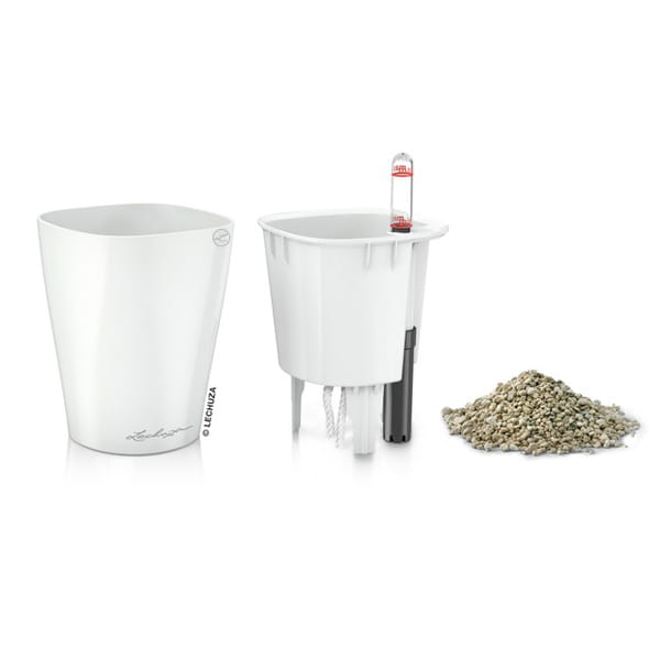Komplet „All-Inclusive” zawiera: doniczkę, wkład wewnętrzny, zestaw nawadniający ze wskaźnikiem poziomu wody/pożywki i sznurkowym knotem podciągającym wodę/pożywkę, substrat LECHUZA-PON.