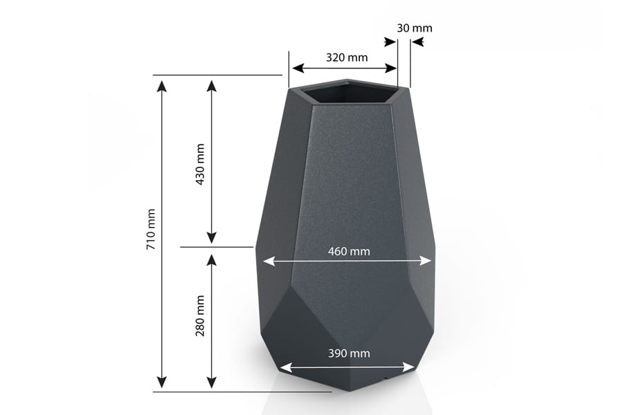 Wymiary zewnętrzne: wysokość 71 cm, długość x szerokość w najszerszym miejscu 46x46 cm, donica dostępna w dwóch wariantach głębokości: płytsza z wewnętrzną półką o głębokości na 25 cm lub bez wewnętrznej półki, w której posadzimy rośliny o większym systemie korzeniowym. Średnica wewnętrznej półki to około 26 cm.