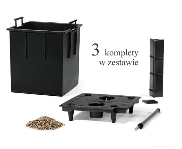 W skład zestawu All Inclusive wchodzą : donica, trzy wkłady wewnętrzne, trzy zestawy nawadniające, substrat Lechuza - Pon. Doniczkę wykonano z wysokiej jakości tworzywa sztucznego-polipropylenu barwionego w masie o strukturze plecionki, przypominają naturalny rattan.