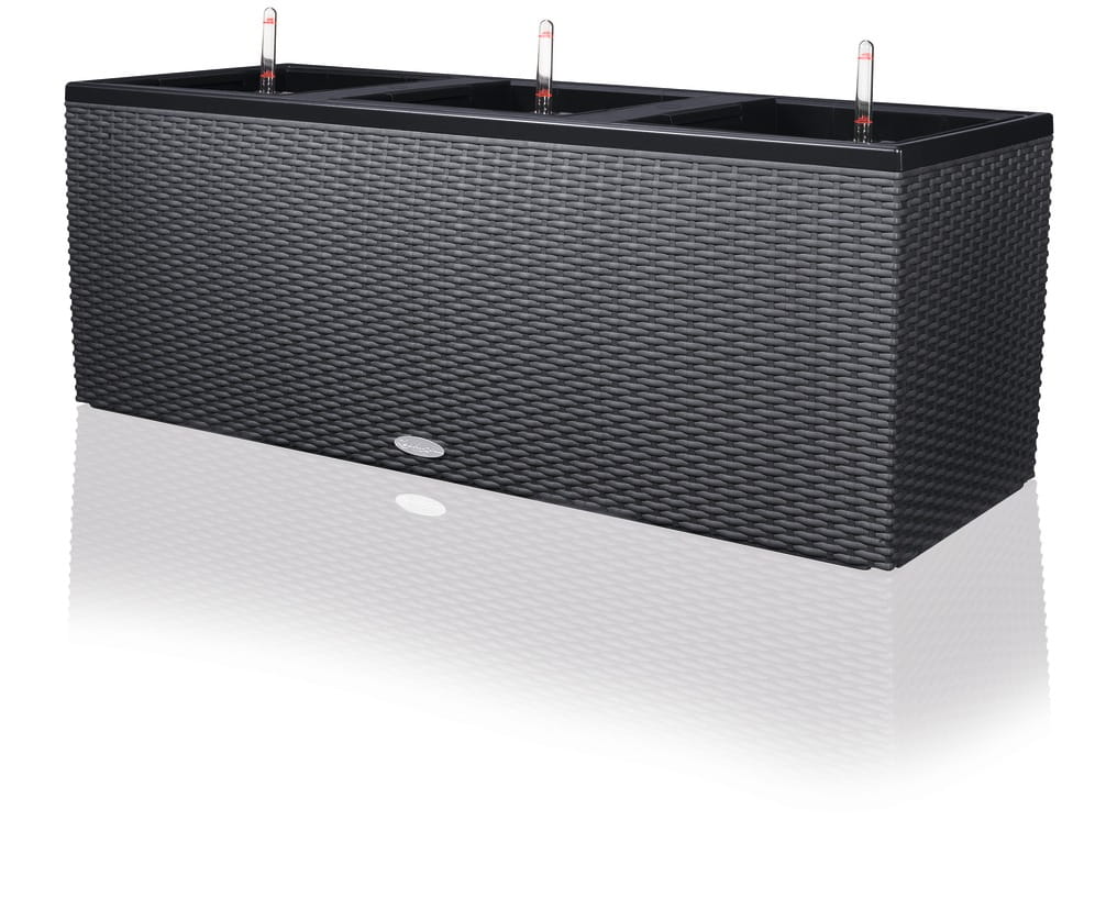 Donica LECHUZA TRIO w kolorze granit pozwala umieścić obok siebie trzy kompozycje kwiatowe. Model ten składa się bowiem z trzech wkładów wewnętrznych oraz z zestawów nawadniających. System nawadniania polega na gromadzeniu się wody na dnie donicy. Wówczas posadzona roślina otrzyma dawkę wody, bez konieczności codziennego podlewania.