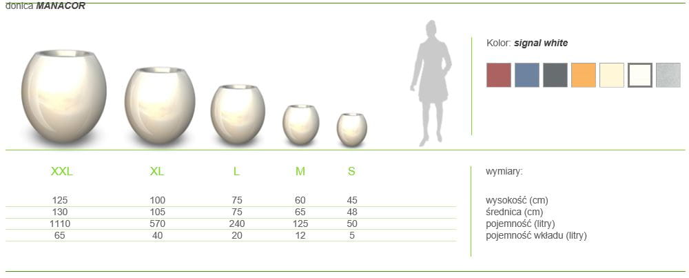 Donice Manacor o zaokrąglonym kształcie zbliżonym do kuli są produktem polskim, wykonane z najlepszych materiałów o wyjątkowej wytrzymałości na wszelkie uszkodzenia mechaniczne. Te cechy idą w parze z odpornością na zmienne czynniki atmosferyczne naszego klimatu: niskie i wysokie temperatury, silne nasłonecznienie, wilgoć, opady deszczu, śniegu oraz biologiczne oddziaływanie w zetknięciu z powierzchnią. Donice Manacor dobierzemy do każdego pomieszczenia bo ich wielkość jest zróżnicowana. Dostępne są następujące rozmiary: