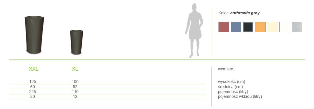 - XXL 125x60 cm - bardzo wysoka donica, idealna do aranżacji ogrodowych, centrów handlowych, w holach, wzdłuż ciągów komunikacyjnych, na tarasach, w nowoczesnych i śmiałych aranżacjach.