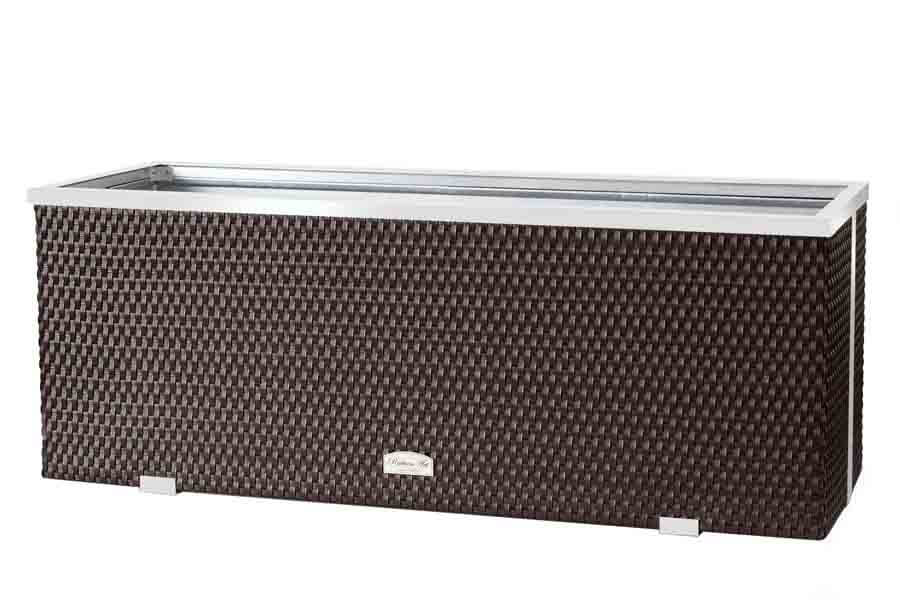 Donice prostokątne z technorattanu są dopracowane w każdym szczególe, eleganckie wykończenie z ramek aluminiowych dodaje atrakcyjności na tarasie i przyciąga uwagę Ogromną zaletą skrzyń rattanowych jest zastosowanie nierdzewnych elementów do wnętrza, gdzie środowisko wilgotnej ziemi jest wyjątkowo "drenujące" każdy materiał z którym się zetknie. Zarówno nawozy zawarte w podłożu jak i flora bakteryjna oraz zasiedlające organiczne podłoża różnego rodzaju organizmy nieustannie "pracują" i przez cały czas oddziałują na wszystkie powierzchnie. Producent uwzględnił wszystkie te aspekty życia mikroflory i mikrofauny glebowej dlatego od wewnątrz zastosował ocynkowaną blachę.
