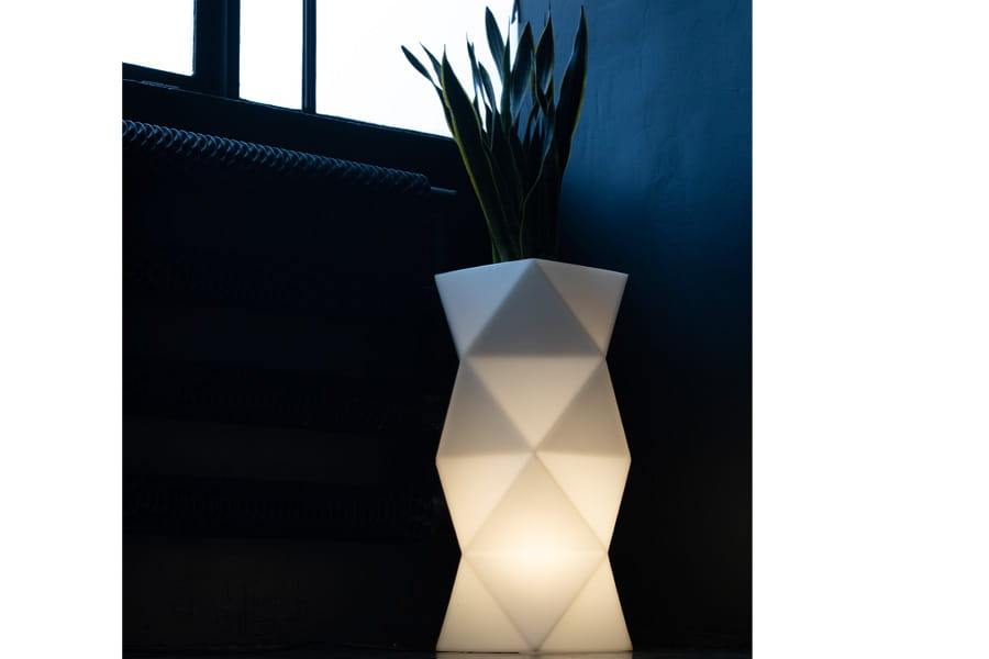 Donica podświetlana Led Asti Light Led, wysoka na 78 cm, wymiary podstawy 29x29 cm ( w najszerszym miejscu 40 cm ), kolor mlecznobiały.
