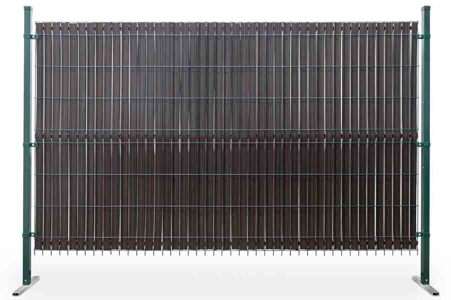 Osłona na płot w postaci listew z tworzywa sztucznego wsuwanych w ogrodzenie panelowe do samodzielnego montażu.