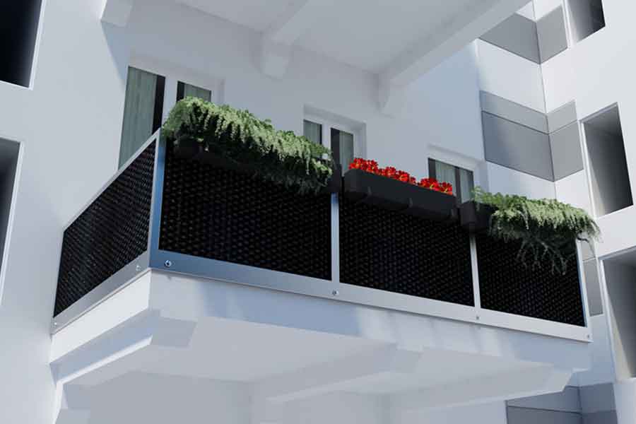 Powyżej: mata osłona rattanowa RD05 antracyt, zamontowana jako osłona balkonowa.