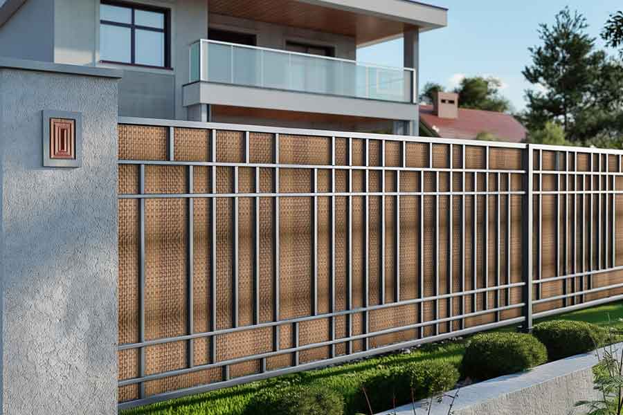 Poniżej mata rattanowa osłona na płot, kolor RD08 słomkowy, zainstalowana na nowoczesnym ogrodzeniu.