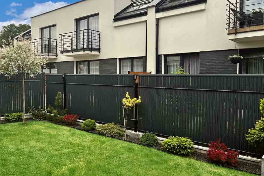 Osłona w postaci listew z tworzywa sztucznego wsuwanych w ogrodzenie panelowe do samodzielnego montażu.