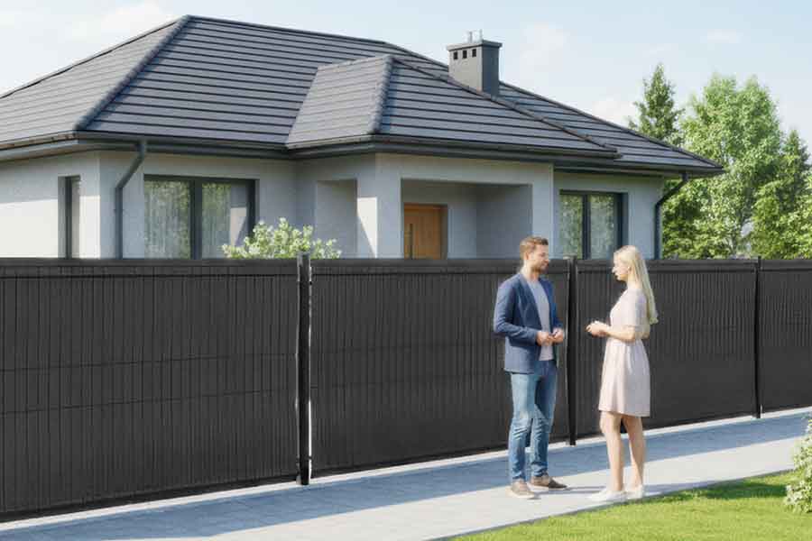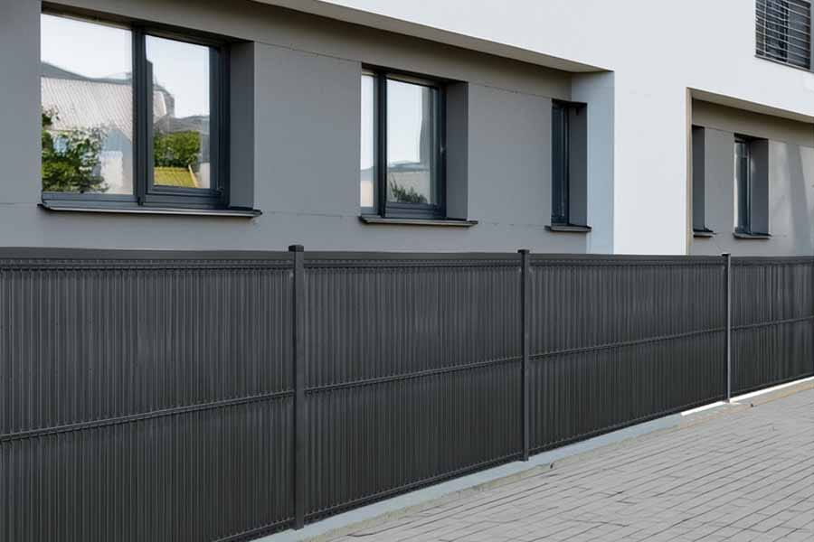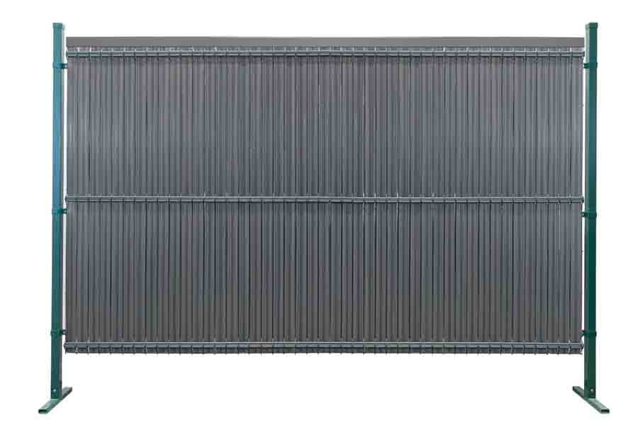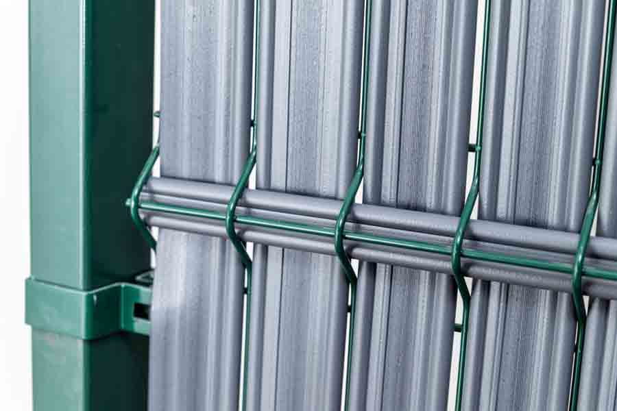 Osłona w postaci listew z tworzywa sztucznego wsuwanych w ogrodzenie panelowe do samodzielnego montażu.