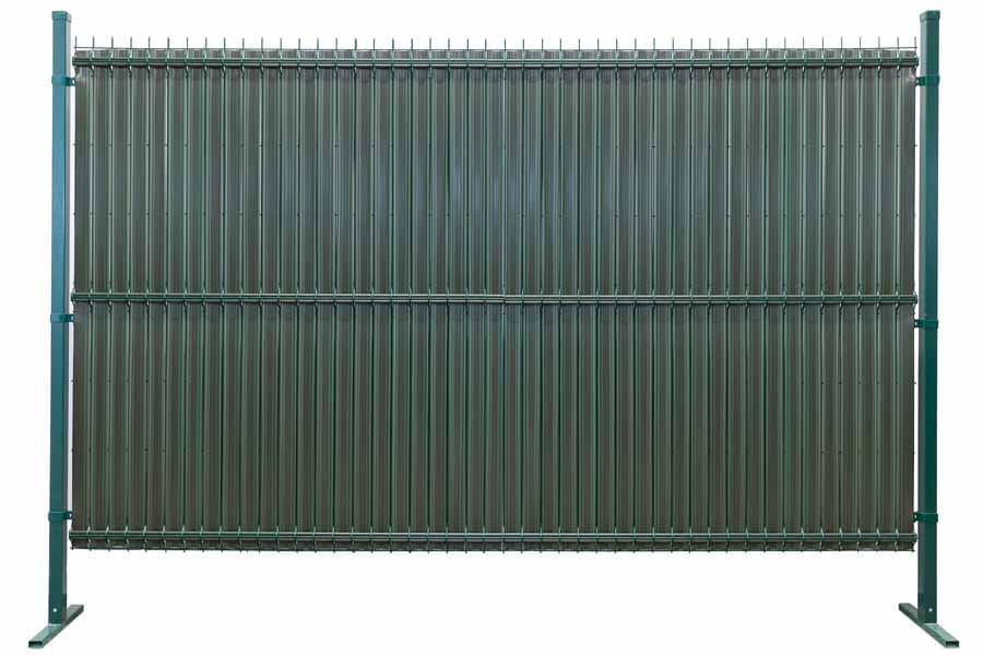 Osłona w postaci listew z tworzywa sztucznego wsuwanych w ogrodzenie panelowe do samodzielnego montażu.